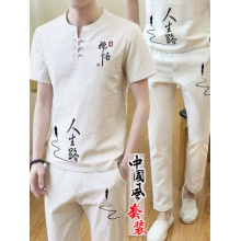 夏季棉麻套装男亚麻短袖t恤潮流休闲半袖唐装汉服中国风男装衣服v